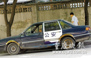 昨上午,記者在天臺崗小學附近,找到了這輛車牌為渝AY1069的“警用”桑塔納。因車身實在怪異,吸引了不少路人觀望,但駕駛員卻毫不在意。記者上前攀談,自稱二手車販的駕駛員爽快的道出了雷人“警車”的來龍去脈。最近,他收購了這輛有11年車齡的桑塔納,因車況太差,只好找了一些舊車部件更新,其中就包括這兩扇來自報廢警車的車門:“現(xiàn)在停在這里,正是因為水箱過熱。”