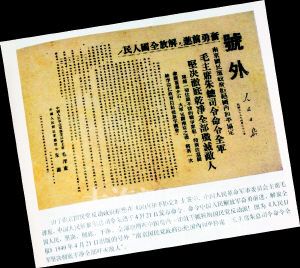 “這本書里我精選了其中的312張?zhí)柾,其中有解放?zhàn)爭(zhēng)時(shí)期人民解放軍解放30個(gè)省會(huì)城市和許多大、中城市時(shí)發(fā)行的報(bào)紙?zhí)柾,以及‘三大?zhàn)役’、渡江戰(zhàn)役等號(hào)外。特別是10多張開國大典號(hào)外,見證了毛主席在天安門城樓上宣告‘中華人民共和國中央人民政府已于今日成立了’的偉大歷史性時(shí)刻!睆埻ψ院赖卣f,書中收藏的大部分號(hào)外是首次面世,其中最珍貴的有兩張:一張是1949年4月21日《人民日?qǐng)?bào)》出版的號(hào)外“南京國民黨政府拒絕國內(nèi)和平協(xié)定毛主席朱總司令命令全軍堅(jiān)決徹底干凈全部殲滅敵人”;另一張是1949年4月24日,解放軍攻入太原,當(dāng)日《人民日?qǐng)?bào)》出版“南京反動(dòng)政府宣告滅亡狼狽奔逃我正向南京急進(jìn)各界已成立治安維持委員會(huì)致電毛主席歡迎解放軍入城”的號(hào)外。