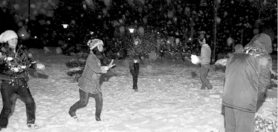 下午5時(shí),停了稍許的雪又開(kāi)始飄落,記者如約趕到綠城廣場(chǎng)噴泉邊,左瞅瞅右瞅瞅,只見(jiàn)一位美女手拿昨日的《鄭州晚報(bào)》,上前聯(lián)絡(luò),原來(lái)是網(wǎng)友“瓦妮莎”。其他人呢,再一看旁邊積滿雪的草地上不少人已經(jīng)不顧嚴(yán)寒和風(fēng)雪打起了雪仗,雖然沒(méi)有拿著“標(biāo)志”,但明顯看出是光棍族的人。
