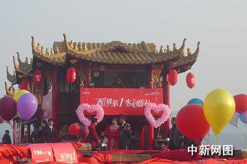 遲來的婚禮將讓姚春曉和新娘終身難忘。今天的水上婚禮在一條浪漫的畫舫上進(jìn)行,畫舫的周圍還簇?fù)碇?00艘掛滿紅燈籠的劃船,儼然像是被紅綢包裹著的白堤。