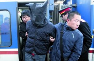 昨日上午,T232次列車(chē)進(jìn)站,旅客中有一群戴著手銬、蒙著頭套的特殊旅客,他們?cè)诿窬垂芟卤谎荷暇?chē)。