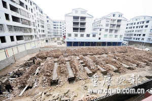 距靈堂不過(guò)300米,就是曾經(jīng)轟動(dòng)全國(guó)的“樓脆脆”所在地——曾經(jīng)開(kāi)裂塌陷并用木梁支撐的房屋,如今已夷為平地,七八個(gè)工人正在夯實(shí)地基。