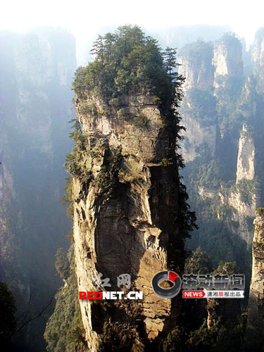 帖子還介紹說,“南天一柱”是張家界“三千奇峰”中的一座,位于武陵源風(fēng)景名勝區(qū)袁家界景區(qū)南端,海拔高度1074米,垂直高度約150米,頂部植被郁郁蔥蔥,峰體造型奇特,垂直節(jié)理切割明顯,仿若刀劈斧削般巍巍屹立于張家界,有頂天立地之勢,故又名“乾坤柱”。
