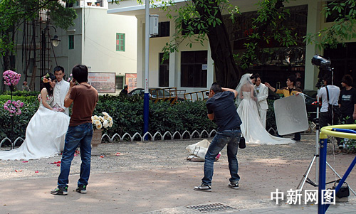 中新網(wǎng)廣州3月29日電 題:沙面取景難度大 婚紗攝影師忙“占位”