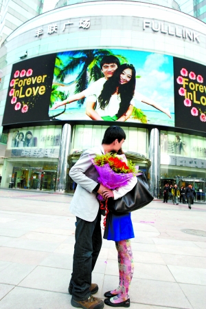 昨天傍晚,22歲的北京女孩婷婷和男友約好了在豐聯(lián)廣場的大屏幕下見面,當(dāng)她剛在大屏幕下停下腳的一剎那,大屏幕上竟傳出了男友叫她的聲音,隨即就是一大段愛情告白和浪漫求婚,婷婷抬頭望著大屏幕,大屏幕上傳出來的是《今天你要嫁給我》的浪漫音樂,畫面上卻是她和男友的一張張?zhí)鹈劭s影,還有正在向自己求婚的男友,真真切切,一時間她愣住了神。2分55秒過后,這段求婚視頻播放完畢,男友從豐聯(lián)廣場里小心翼翼地走了出來,期待著婷婷的點頭答應(yīng)。婷婷這才相信,這真的是男友向她的求婚,她拭去晶瑩的淚花,奔向男友的懷抱,緊緊相擁。這一瞬間感動了圍觀的群眾,大家熱烈鼓掌,祝福這對帥哥美女終成眷屬。