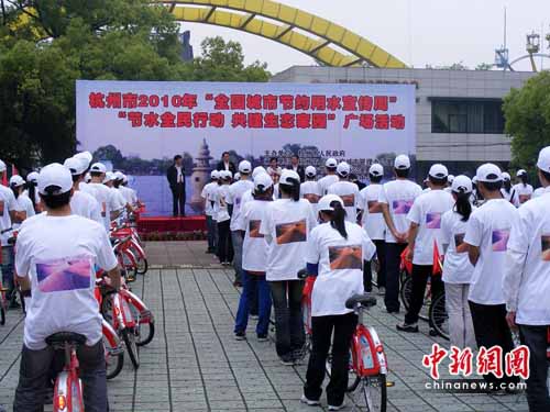 中新網杭州5月15日電(記者 趙曄嬌 實習生 徐進軍)今天,杭州市“全國城市節(jié)約用水宣傳周”活動在該市少年宮廣場舉行,由近五十名大學生組成的節(jié)水志愿者車隊騎著公共自行車環(huán)繞西湖,倡導“節(jié)水減排,綠色出行”,提高市民低碳意識。據悉,杭州水資源緊缺的矛盾日益嚴峻,僅去年末總蓄水量就較2008年同期減少10.14億立方米,相當于減少近100個西湖的水量。