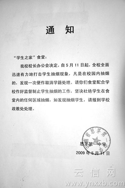 2010年6月1日,普洱市思茅區(qū)教育局向區(qū)屬23所校園發(fā)出《思茅區(qū)教育局關(guān)于在校園內(nèi)公共場(chǎng)所禁煙的通知》(以下簡(jiǎn)稱《通知》)!斑@是云南省第一家自發(fā)進(jìn)行控?zé)煿ぷ鞯慕逃龁挝。”云南省健康教育所控(zé)熮k公室主任趙白帆說(shuō)。