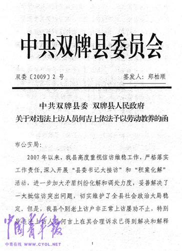 33歲的何守業(yè)至今不敢回家。其父何吉上因舉報村支書侵占退耕還林款未見“效果”,多次上告,被認定“沖擊國家機關”。在檢察機關認定其不構成犯罪之后,湖南省永州市雙牌縣委書記鄭柏順簽發(fā)“勞教”文件。2009年8月,永州市“勞教委”決定對何吉上勞動教養(yǎng)一年。
