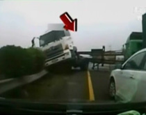 實拍臺灣高速路貨柜車“驚魂橫撞”回彈