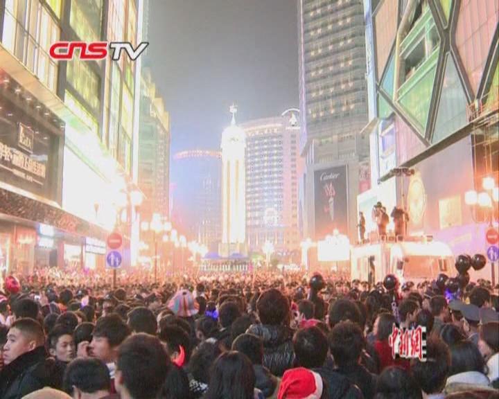 【解說詞】據(jù)了解,近年來每逢圣誕平安夜,便會有大量的山城市民自發(fā)的在重慶標志性建筑物解放碑守候鐘聲。雖然今年重慶主城部分道路實施了交通控制,但人們熱情不減,仍有上十萬市民涌入解放碑共度圣誕節(jié)。