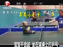 寶寶不會站 坐在球桌上打乒乓