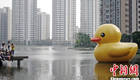 天津大黃鴨現(xiàn)身首日被吹翻