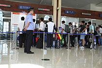 圖:伊春機(jī)場(chǎng)乘客在辦理登機(jī)手續(xù)