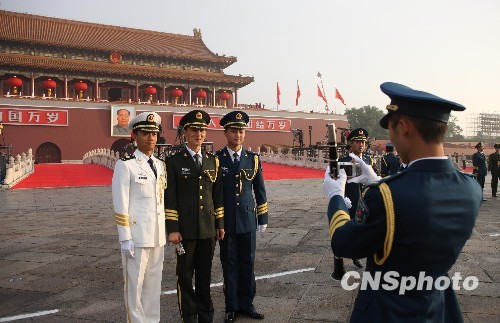 圖:軍樂(lè)隊(duì)隊(duì)員在天安門前合影