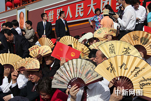 圖:天安門朗日當(dāng)頭照 觀禮臺(tái)嘉賓忙遮陽(yáng)