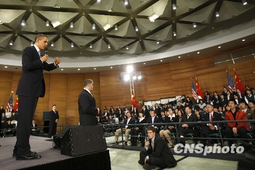 圖:美國總統(tǒng)奧巴馬在上海與中國青年對話
