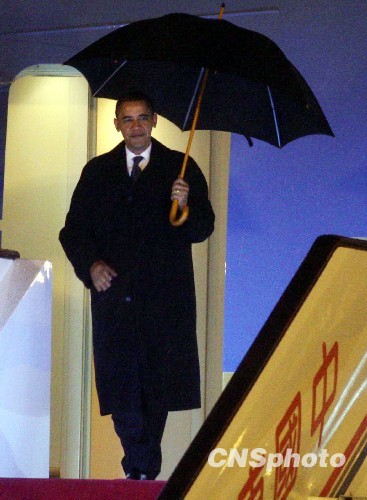 圖:美國總統(tǒng)奧巴馬抵達上海 記者雨中等候