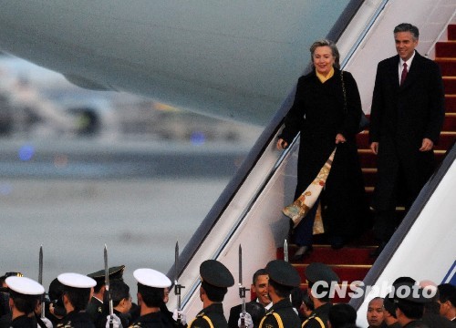 圖:希拉里與奧巴馬同機抵達北京