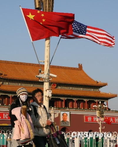 圖:中美兩國國旗天安門廣場共飄揚