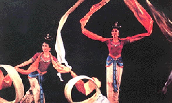 舞蹈《飛天》不僅是當(dāng)代中國第一部取材于敦煌壁畫的舞蹈作品,同時也是繼承戲曲中的長綢舞并加以發(fā)展、創(chuàng)新,使之成為獨(dú)立的純舞蹈藝術(shù)的第一部成功之作。從1954年首演至今,經(jīng)久不衰。