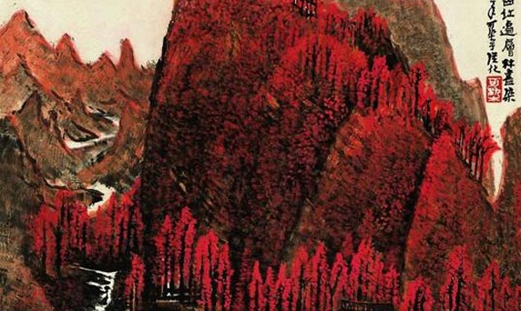 《萬山紅遍層林盡染》是根據(jù)毛澤東詩詞《沁園春·長沙》所作。李可染喜讀毛主席詩詞,并從那激越豪邁的詩里領(lǐng)略山水畫的境界。此畫是據(jù)“萬山紅遍,層林盡染”句意再造了一個藝術(shù)世界,在黑紅對比中寫南國深秋景色,帶有理想化的詩意色彩。