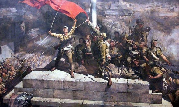 《占領(lǐng)總統(tǒng)府》表現(xiàn)的是中國(guó)人民解放軍占領(lǐng)南京總統(tǒng)府,升上紅旗的場(chǎng)面,標(biāo)志著蔣家王朝的滅亡,新中國(guó)的開(kāi)始。作品場(chǎng)面壯觀,氣勢(shì)恢弘。畫家用現(xiàn)實(shí)主義的創(chuàng)作方法使這一歷史題材的創(chuàng)作具有紀(jì)念碑的意義。