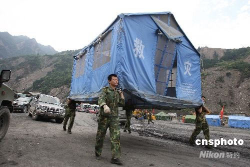 圖:鐵軍官兵搬遷帳篷準(zhǔn)備重建新映秀