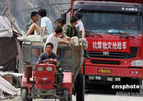 圖:四川震區(qū)村民開拖拉機(jī)返鄉(xiāng)準(zhǔn)備重建家園