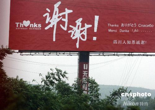 震區(qū)宣傳牌多國(guó)語言感謝中國(guó)和國(guó)際社會(huì)
