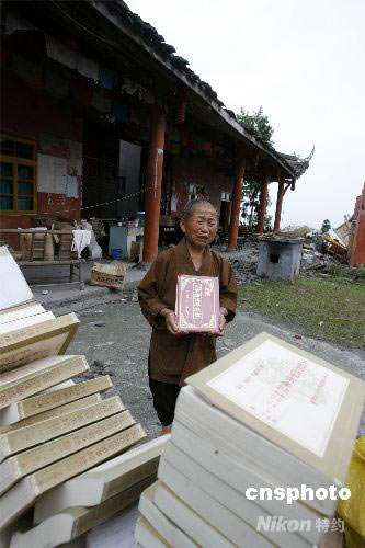 圖:尼姑從垮塌的大殿中搶救出的經(jīng)書