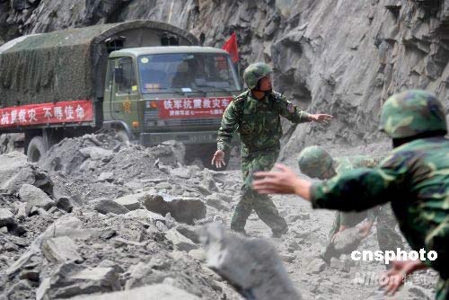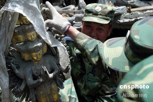 圖:解放軍在藏寨廢墟中搶救珍貴文物