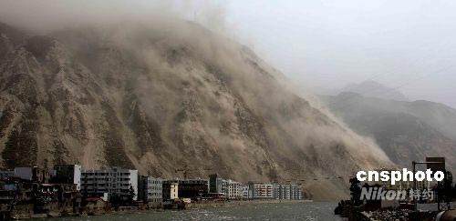 圖:山體滑坡煙塵籠罩下的汶川縣城