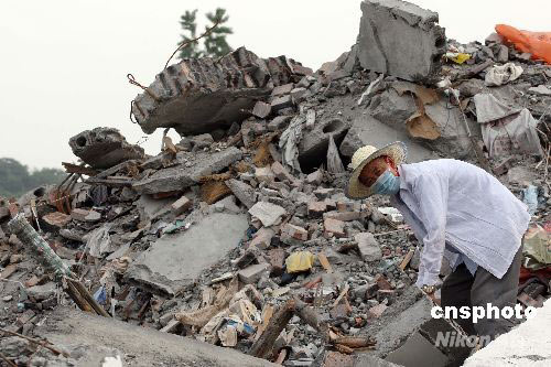 圖:幸存者在向娥中學廢墟中尋找遺物