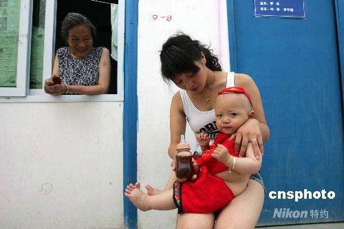都江堰災民安置點簡易房前的祖孫三代