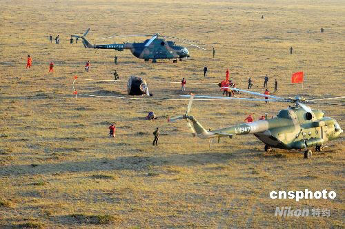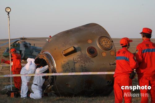 圖:搜救隊(duì)員到達(dá)神七返回艙著陸現(xiàn)場