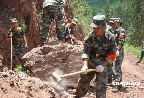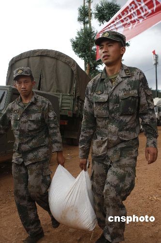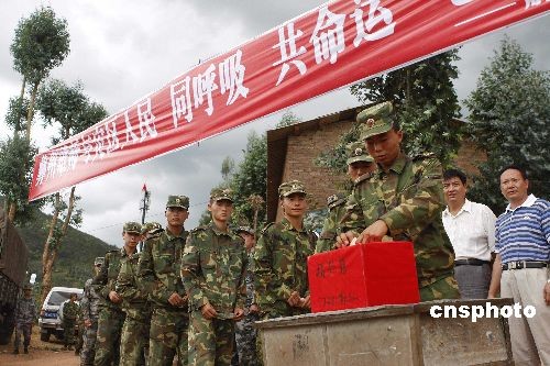 圖:救災(zāi)官兵為云南地震災(zāi)區(qū)民眾獻(xiàn)愛心