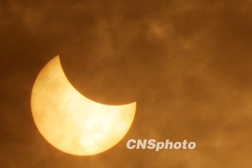 中國各地觀測日食奇觀:江蘇贛榆透過薄云看日食