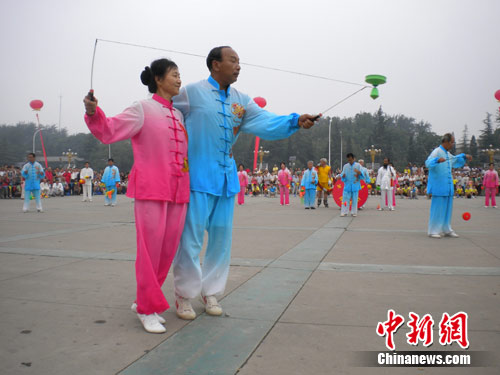 在保定人民廣場(chǎng)主會(huì)場(chǎng),近千名空竹愛(ài)好者在空竹大師吳春鳴的帶領(lǐng)下,通過(guò)“群英薈萃”、“龍飛鳳舞”、“竹韻聲聲”、“激情飛揚(yáng)”等表演,把空竹的盤(pán)、拋、接等技巧表現(xiàn)的淋漓盡致。場(chǎng)上巨型空竹、雙人空竹、輪滑空竹、頂竿空竹、呼啦圈空竹漫天飛舞,蔚為壯觀。