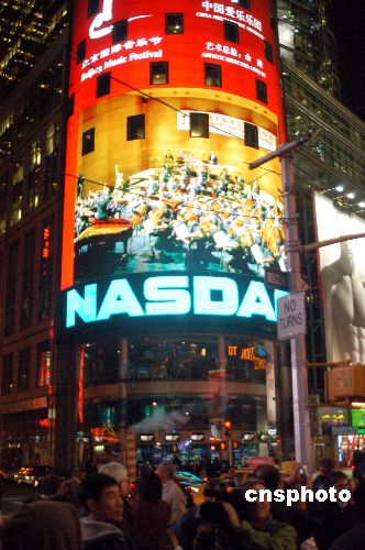 中國著名青年鋼琴家郎朗與中國愛樂樂團(tuán)在北京第十屆國際音樂節(jié)上合作演出鋼琴協(xié)奏曲《黃河》,美東時間十月二十五日晚七時,紐約地標(biāo)時代廣場前的巨大電子顯示屏組進(jìn)行轉(zhuǎn)播,吸引大量來自全球各地的旅游者和當(dāng)?shù)厝笋v足欣賞。中新社發(fā) 鄧悅 攝