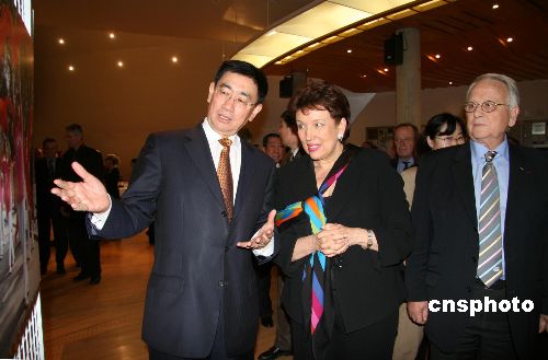 11月7日晚,由中國(guó)駐法使館和法國(guó)奧委會(huì)共同主辦的“北京歡迎您”迎奧運(yùn)圖片展,在巴黎法國(guó)奧委會(huì)總部、法蘭西運(yùn)動(dòng)之家隆重開幕。旅法華人社團(tuán)僑領(lǐng)等各界人士約400人出席了開幕儀式。圖為中國(guó)駐法大使趙進(jìn)軍和法國(guó)衛(wèi)生、青年與體育部長(zhǎng)巴舍洛-納爾坎女士,法國(guó)奧委會(huì)主席塞朗杜爾參觀圖片展。中新社發(fā) 鐘誠(chéng) 攝