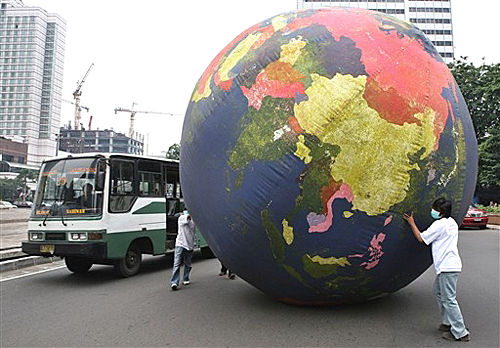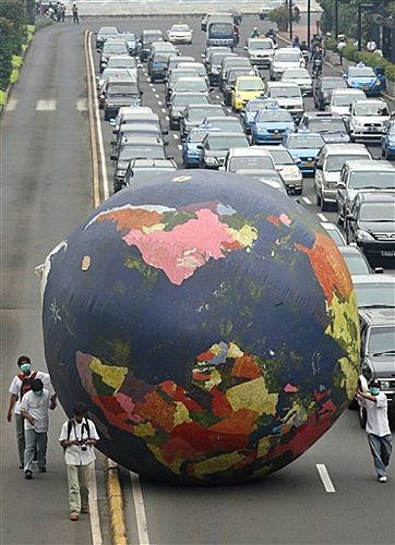 11月16日,印尼的環(huán)保主義者在首都雅加達(dá)推動(dòng)一個(gè)巨大的充氣地球模型,參加此次“清潔空氣,控制溫度”活動(dòng)。印尼是全球重要的溫室氣體排放國(guó)。今年12月印尼巴厘島將迎來(lái)聯(lián)合國(guó)氣候變化大會(huì)。