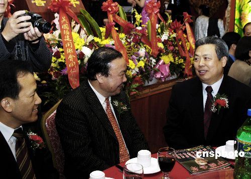 當(dāng)?shù)貢r(shí)間一月八日晚,中國(guó)駐紐約總領(lǐng)事館總領(lǐng)事彭克玉大使(右)在紐約曼哈頓華埠美東僑界為他舉辦的歡迎晚宴上與華聯(lián)總會(huì)共同主席梁冠軍(左)和陳清泉(中)親切交談。中新社發(fā) 鄧悅 攝