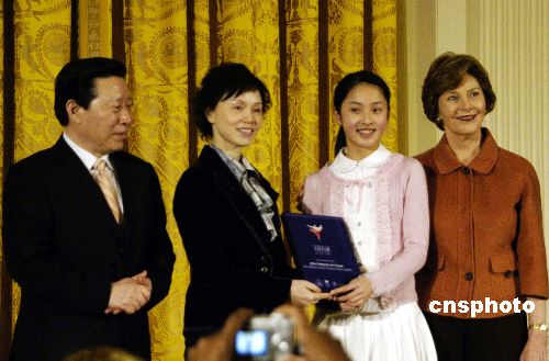 中國文化部部長孫家正(左一)今天上午在美國白宮與美國總統(tǒng)夫人勞拉·布什(右一)一起向中國福利會上海少年宮“小伙伴藝術(shù)團(tuán)”代表陳白樺老師(左二)、李蒙初同學(xué)(右二)頒發(fā)“站得更高”獎狀。中新社發(fā) 邱江波 攝