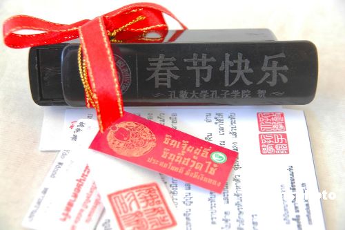 孔敬大學(xué)的校領(lǐng)導(dǎo)、各學(xué)院的院長、孔敬市的華僑領(lǐng)袖,以及中小學(xué)校長們都收到了來自孔子學(xué)院的禮物——一枚中國印章,上刻有他們的音譯中國名字,并附有泰文說明,說明中國名字的意義、印章的功能和歷史發(fā)展。