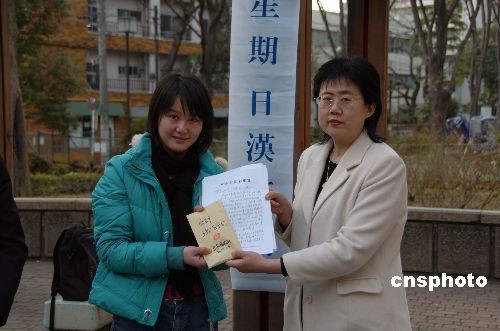 3月9日,日本東京漢語角舉行的第30次交流會上,日本僑報社社長張景子(右)代表中日兩國的捐款者,把全部捐款和寫給湖南省長周強的信,轉交給了正在日本訪問的湖南省人民對外友好協(xié)會干部曾卓然(左),表達大家對湖南災區(qū)人民的關切之情。近一個月來,日本僑報社組織的為湖南災區(qū)人民捐款活動,共收到4個團體、53位日本友人和在日華人的全部捐款38.2885萬日元。中新社發(fā) 段躍中 攝
