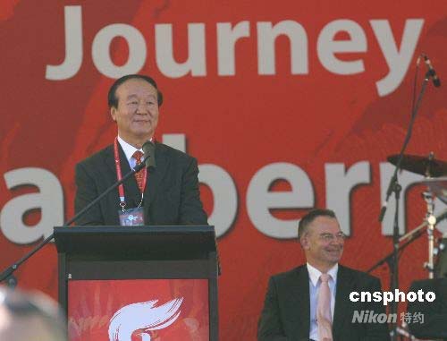 4月24日中午11時35分,北京奧運圣火在澳大利亞首都堪培拉的傳遞順利結(jié)束。北京奧運圣火在堪培拉的傳遞從和解廣場開始后,途經(jīng)戰(zhàn)爭紀念館、高等法院、國家圖書館、國會大廈等地,最終于中午12時左右在聯(lián)邦公園點燃圣火盆并舉行慶典儀式?芭嗬瓊鬟f路線全長約15公里,80位火炬手,平均每人傳遞190米左右。圖為北京奧組委執(zhí)行副主席蔣效愚(左)在慶典儀式上致辭。