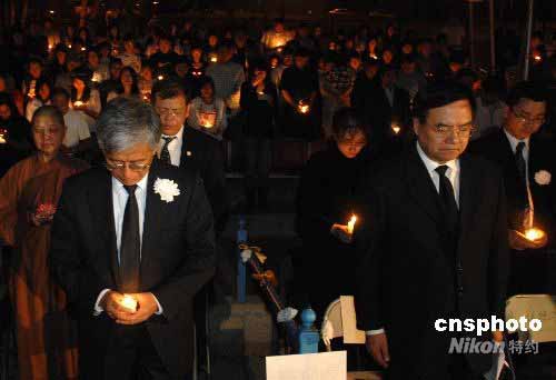 南加州悼念中國汶川地震遇難同胞燭光追思會當?shù)貢r間五月二十一日晚在美國加州蒙特利公園市舉行。各界人士手捧蠟燭在夜色中默默祈禱,悼念中國汶川地震遇難同胞,愿逝者早日安息,生者更加堅強。圖為中國駐洛杉磯總領(lǐng)事張云(前左)、南加州華人聯(lián)合總會會長程遠(前右)和大家一起為遇難同胞默哀。中新社發(fā) 張煒 攝