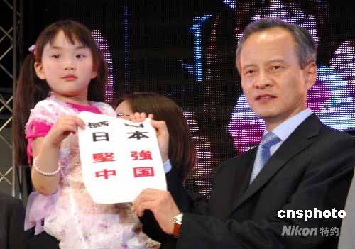 5月25日,中國駐日本大使崔天凱(右)出席在東京六本木舉行的四川大地震賑災(zāi)義演,與華人小女孩共舉“感謝日本,堅強中國”標語。中新社發(fā) 侯宇 攝
