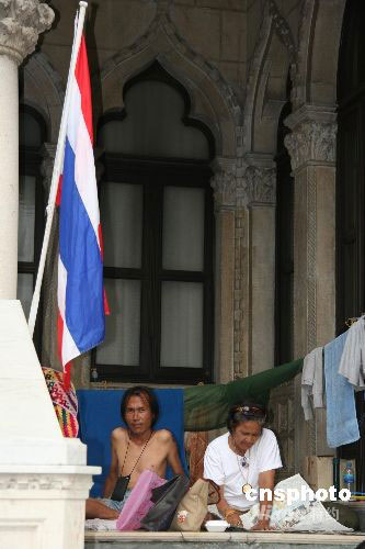盡管泰國憲法法院九月九日已經(jīng)判決總理沙瑪因主持電視節(jié)目違背憲法無資格當總理,但占據(jù)總理府的民盟示威者依然沒有離去。在總理府的過道上走廊里,隨處可見半躺半睡的示威者,或在看直播演講的電視,或上網(wǎng),或隨音樂唱歌跳舞,千姿百態(tài)。中新社發(fā) 顧時宏 攝