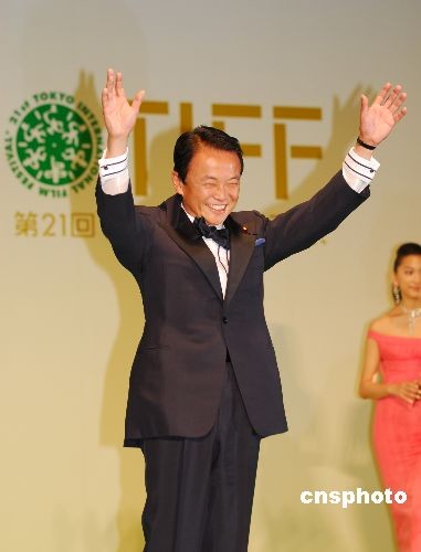 10月18日傍晚,第21屆東京國際電影節(jié)開幕。以“環(huán)!睘橹黝}的本屆電影節(jié)別出心裁地將星光大道的地毯由紅色改為綠色。上個月剛剛當(dāng)選日本首相的麻生太郎與開幕影片《赤壁》劇組成員同走綠地毯,成為第一個光臨東京國際電影節(jié)現(xiàn)場的日本總理大臣。中新社發(fā) 侯宇 攝